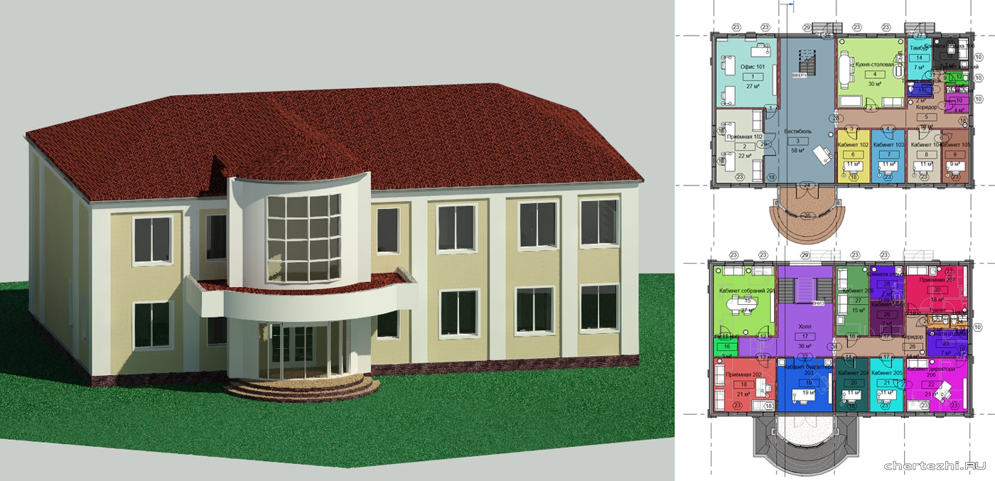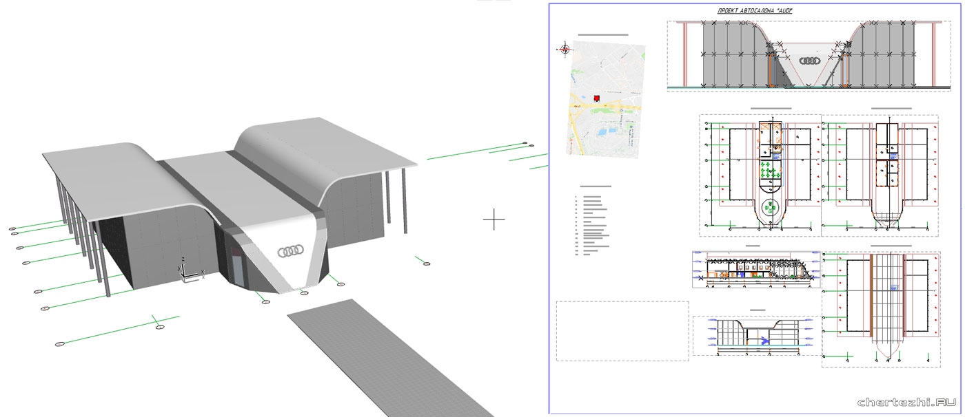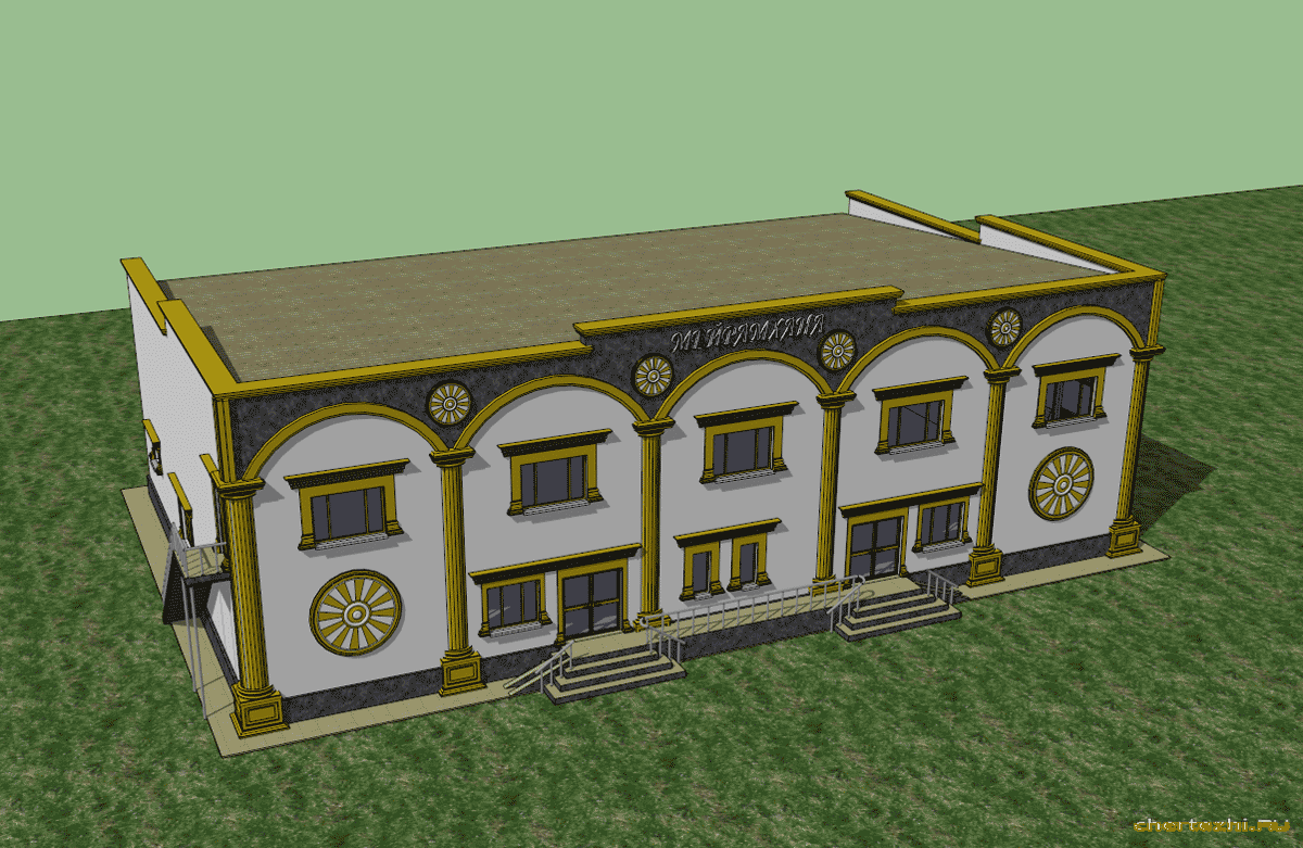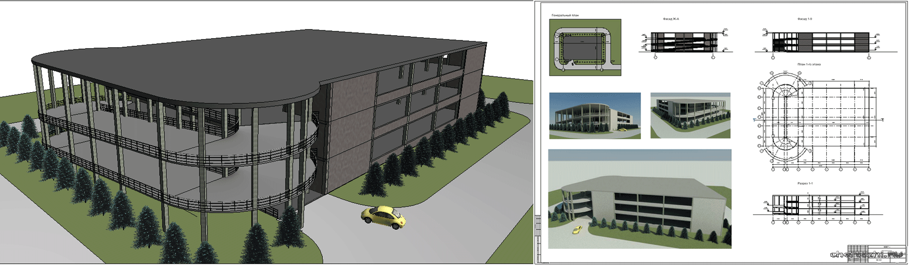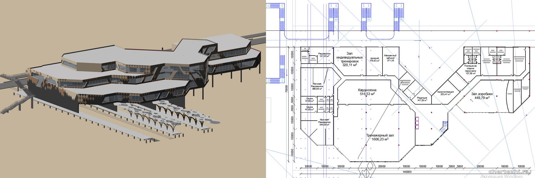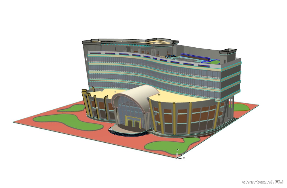 В здании запроектированы фитнес клуб, фудкорт, кинотеатр, ресторан. Размер 70х140 м / Состав: 3D модель (планы 1,2,3 этажей, разрез по зданию), вес 213 Мб
