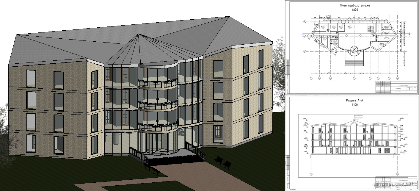 СПбПУ / Количество номеров по типу: - Номер одноместный - 11; - Номер двухместный - 13; - Номер трехместный - 7 / Состав: 3Д модель + чертежи 9 листов (генплан, фасады, разрез, план 1 этажа, план 2 этажа, план 3 и 4 этажа, план кровли)