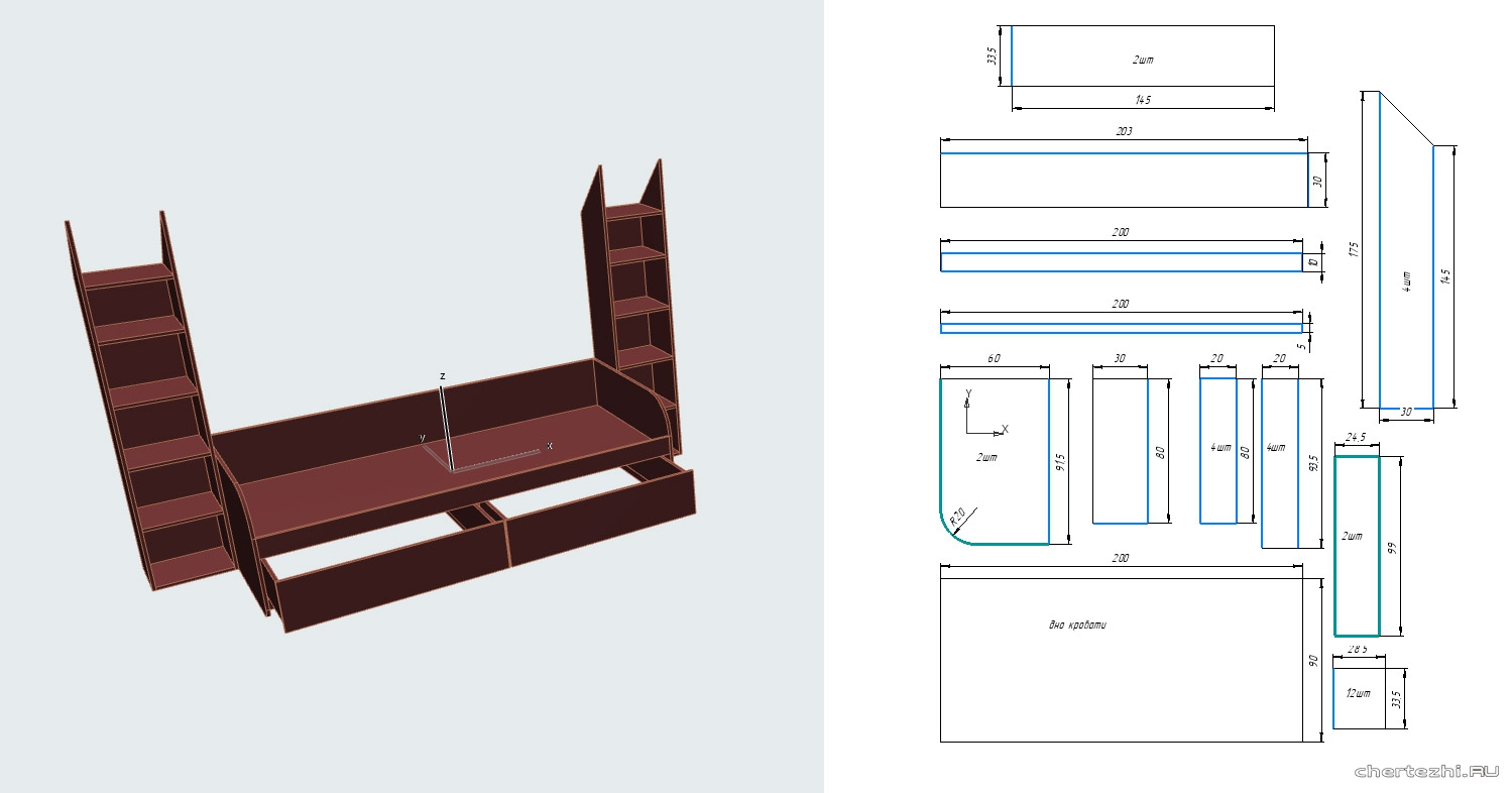 Документация представлена в виде 3D модели в формате igs. Для моделирования использовались программы SolidWorks, Inventor, SketchUp и др. На сайте происходит постоянное обновление доступных проектов. Модель мебель 3D – проект, который позволяет рассчитать сметы затрат и расходов: на материалы и работы. Программы выполняют оптимизацию проекта на стадии проектирования. Программные модули формируют экономичный вариант раскроя. Рассчитываются карты раскроя листов, и при необходимости, вносятся изменения, для уменьшения остатков материала. При проектировании происходит автоматическая корректировка параметров, в случае изменения заданных размеров. При модульном проектировании выполняются чертежи, схемы сборки, с подробным описанием последовательности выполнения операций. Разработанная программа используется для изготовления – как носитель информации для станков с ЧПУ.