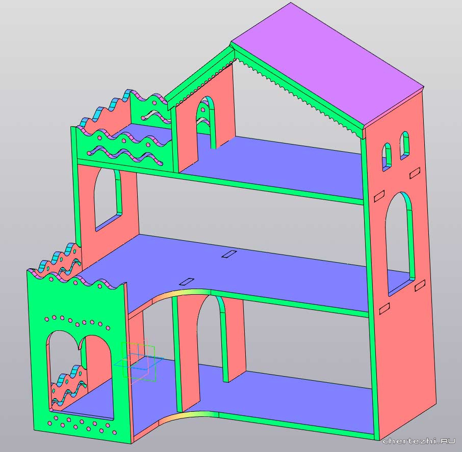 Дом разрабатывался для изготовления на фрезерном станке с ЧПУ из фанеры 8 мм размер листа необходимого для изготовления 1.156 м*2. Рассчитан на изготовление фрезой не более 3 мм. / Состав: 3D-cборка Кукольного домика + 3D-модели всех деталей (фасад, стенки, украшения, перегородки, ограждения, крыша, балкон).