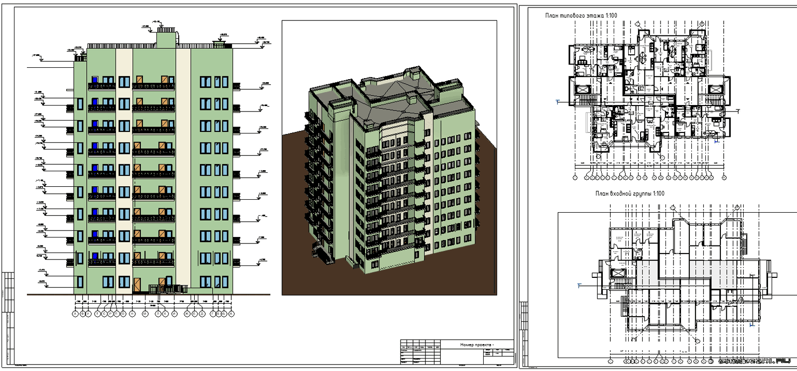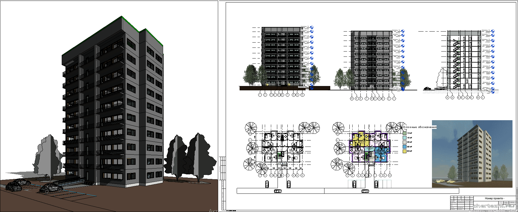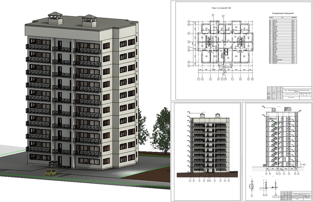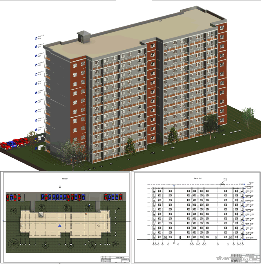 Для дипломного проектирования / Двухсекционный многоквартирный жилой дом / Состав: 3D модель с проработанными планами кровли, тех этажа, типового этажа, разрез, фасады