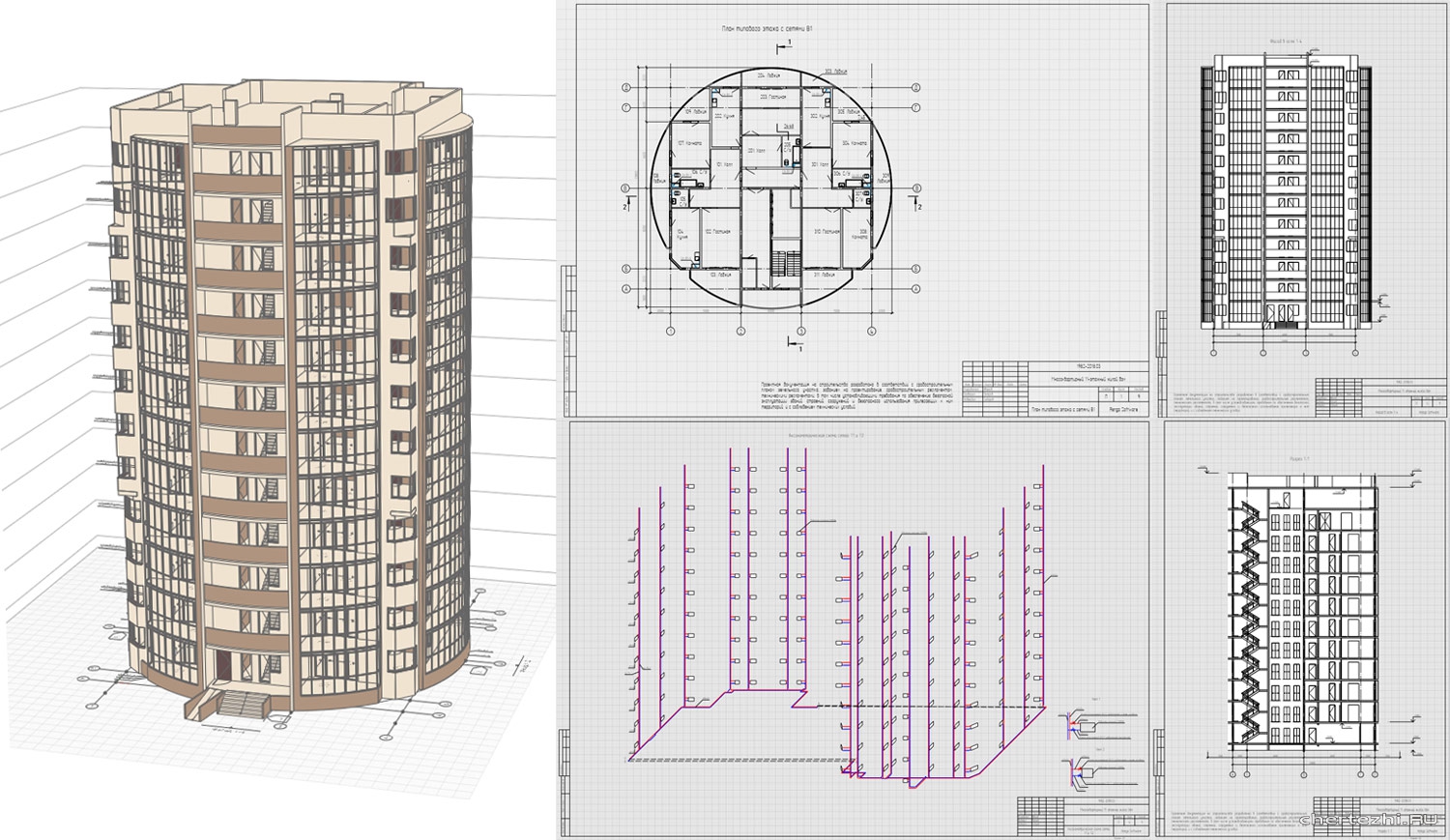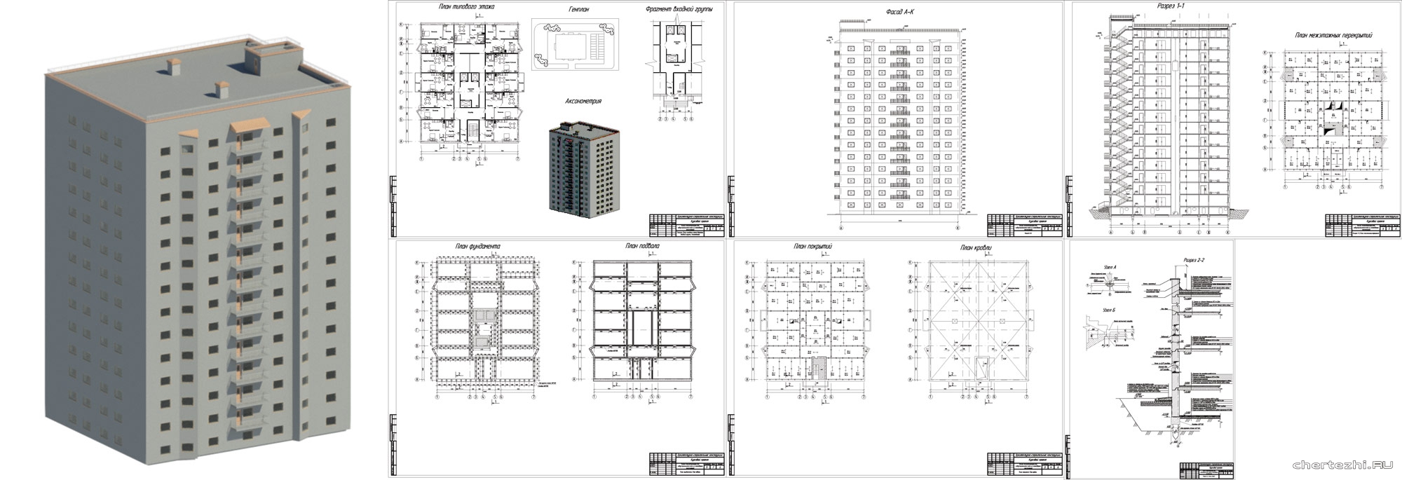 ННГАСУ / Кафедра архитектуры / Запроектировать монолитное многоэтажное жилое здание. В осях: 27,3 х 26,4 м. / Состав: 3Д модель + 1 лист чертеж (планы этажей, разрез, узел, СПОЗУ)