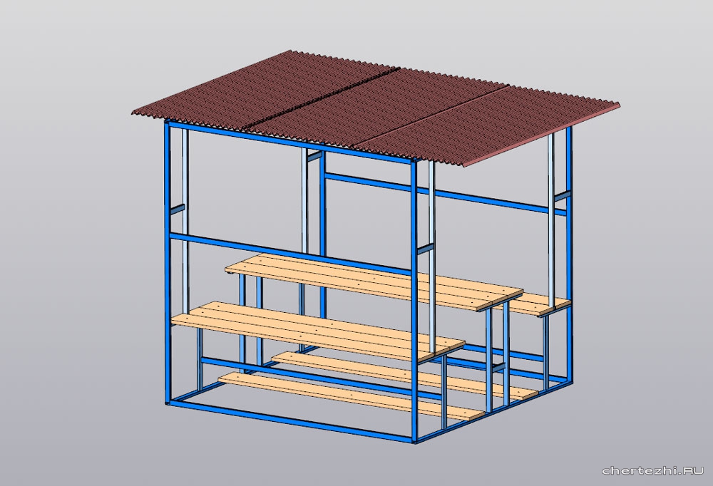 Опытный образец / Беседка крытая ондулином для дачи. Сварной каркас из профильной трубы 40х20. Настил скамеек и стола-доска 25 мм / Состав: 3Д модель беседки (сборки и детали 3Д)