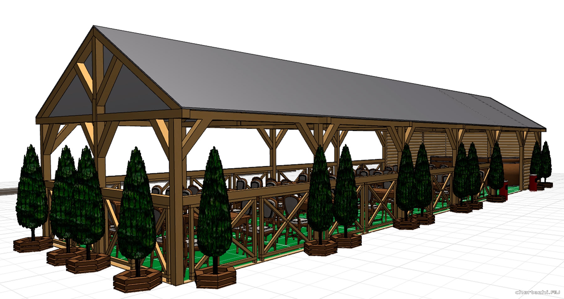 Проект состоит из планов, фасадов, визуализации, ситуационной схемы,плана оборудования, декоративных элементов. Летняя площадка имеет двухскатный деревянный навес 4,5 х 17 м. / Состав: 3D модель + чертежи