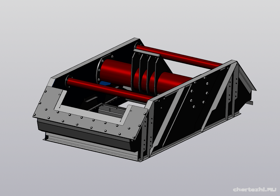 Mongoose PRO — вибросито двойного действия. За счет особой конструкции обеспечивает возможность применения как сбалансированных эллиптических колебаний, так и прогрессивно-эллиптических колебаний на виброраме. / Состав: 3Д модель сборка, детали